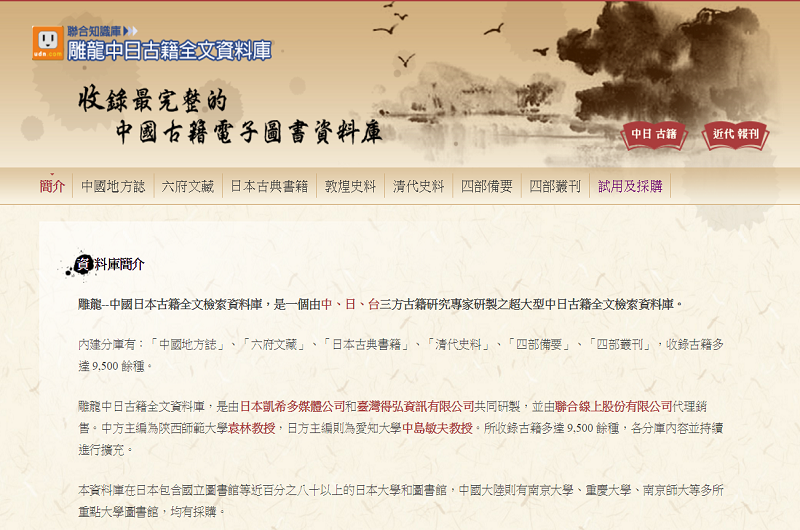 本資料庫是一個由中、日、台三方古籍研究專家研製之超大型中日古籍全文檢索資料庫。內建分庫有:「中國地方志」、「六府文藏」、「日本古典書籍」、「清代史料」、「四部備要」、「四部叢刊」,收錄古籍多達 9,500 餘種。資料庫提供「原文圖象」及「全文文本」兩種閱讀介面,便於資料查證與對照。此外,各筆資料除詳列版本、出處、纂修資訊外,方志部分更明列今昔地方縣市的題名對應,完整顯示典籍編修演變的資訊元素。